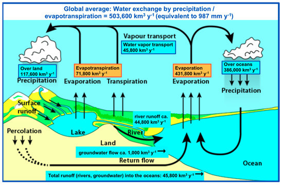 The common description of the water cycle, or hydrological cycle, as consisting of evaporation, condensation, and precipitation is too simple to account for the high degree of complexity of the involved phenomena. Several physical processes contribute significantly to determining the final balance (or local imbalance), such as water vapor transport, sublimation, surface runoff, soil moisture, infiltration, percolation, plant uptake, and groundwater flow [1,2,3], as detailed in Figure 1. Moreover, evaporation happens not only from the surface of water bodies, but also from clouds and falling precipitation. However, another element is completely overlooked in this description: human influence, a key factor which is imposing a change of perspective if we want to quantify water cycle changes in the changing climate of the Anthropocene age [4].