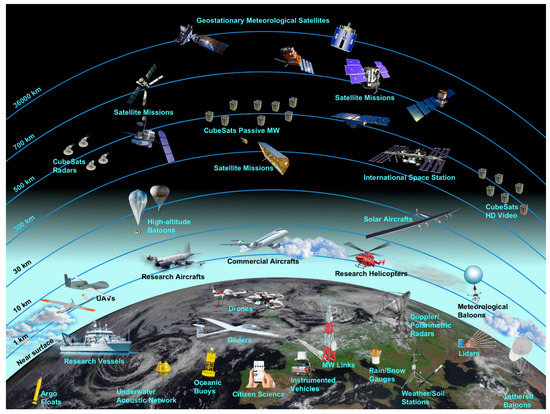 The investigation of the various climate processes requires the implementation and maintenance of a complex observation system with ground, airborne, and spaceborne components (Figure 4). Most of the sensors are already in place for meteorology, hydrology, and climatology, as documented by the Observing Systems Capability Analysis and Review (OSCAR, https://www.wmo-sat.info/oscar/, last accessed 27 May 2019) tool of the World Meteorological Organization (WMO), which defines the requirements for the observation of physical variables. The Global Climate Observing System (GCOS, https://gcos.wmo.int/en/home, last accessed 21 August 2019) maintains the definitions and observation needs [38] of the Essential Climate Variables (ECVs) required to systematically observe the Earth’s changing climate. Ground-based observations produce datasets for estimates of changes in the hydrological cycle and for deriving trends [39], but this happens only in limited areas of the world, where the observing networks are dense enough and ensure adequate quality standards.