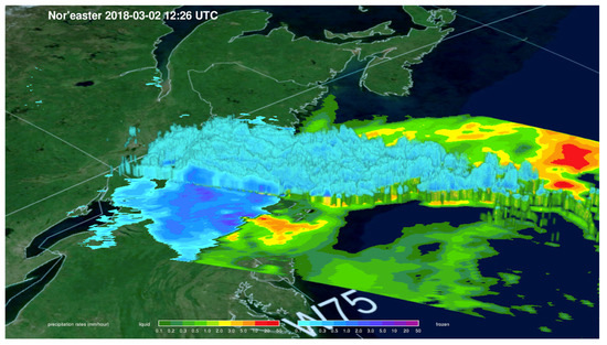 GPM Core Observatory view of the “Nor’easter” winter storm on 2 March, 2018 over the Eastern US. Rainfall rates are shown in warm colors and snow-bearing clouds and falling snow in bluish colors. Courtesy of NASA (https://pmm.nasa.gov/extreme-weather/gpm-examines-snow-destructive-noreaster, last accessed 24 September 2019).