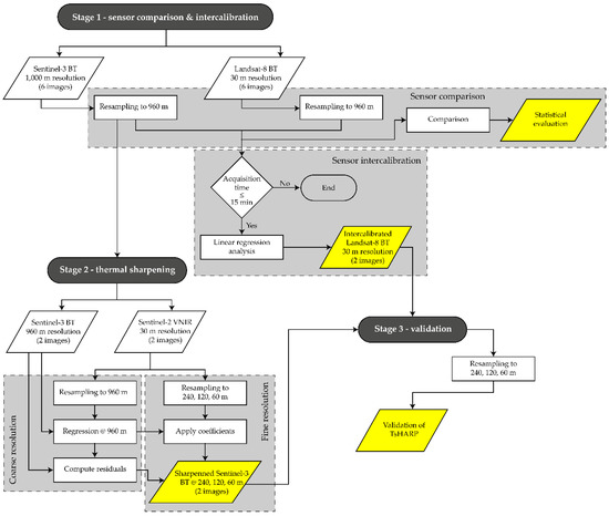 Stage 1–sensor comparison and inter-calibration–before using Landsat-8 to validate the sharpening product, the comparability between the Sentinel-3 and the Landsat-8 thermal images had to be evaluated. To this end, six pairs of Sentinel-3 vs. Landsat-8 thermal images, acquired within a maximum of a 15-minute time difference, were compared. To minimize potential additional sources of error due to different atmospheric corrections between the two sensors [34], the comparison, as well as the sharpening, was applied on top-of-atmosphere brightness temperature (BT) images, which has been previously done (e.g., [19,25,35]). The six BT image-pairs were compared at the coarse resolution of 960 m (see more in Section 2.4 hereafter). For the following analyses, two of the six pairs of images, for which a coinciding same-day Sentinel-2 overpass was available (Table 1), were chosen. For these two pairs, the linear regression coefficients resulting from regressing the Sentinel-3 BT values against the Landsat-8 BT values were used to calibrate the images. The calibrated Landsat-8 BT images were used in Stage 3 for validation (see below).