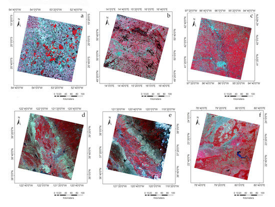 Landsat 8 OLI color-infrared images at 30-m spatial resolution for: (a) Site 1, image acquired on 13 July 2017. (b) Site 2, image acquired on 20 June 2017. (c) Site 3, image acquired on 16 July 2017. (d) Site 4, image acquired on 16 July 2017. (e) Site 5, image acquired on 9 July 2017, and (f) Site 6 image acquired on 17 October 2017. The outlines in Panels b and e delineate the analyzed areas.