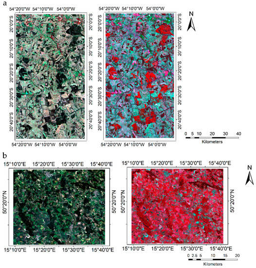 Areas used for sharpening and NDVI calibration in natural and false colors. (a) Site 1, image collected on 13 July, 2017, and (b) Site 2, image collected on 20 June, 2017.