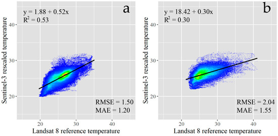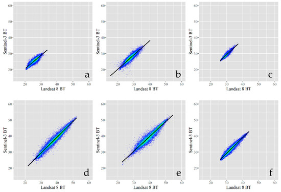 To the best of our knowledge, the relationship between Sentinel-3 and Landsat 8 thermal bands has not yet been reported. Studies comparing land surface temperature from MODIS and Landsat platforms [41] revealed a significant difference between sensors induced by sensor measurement errors and systematic errors that have led to alterations in radiance at the sensors. Liu et al. [42] found a discrepancy between MODIS and aggregated ASTER surface temperature of about 3 °C due to the difference in the retrieval algorithm, atmospheric correction, and sensor performance. Merlin et al. [43] also reported errors between MODIS and ASTER data of about 2.4 °C. Weng et al. [44] pointed out that thermal data from different sensors at a close acquisition time can be comparable after applying pre-processing procedures, such as radiometric calibration, geometric detection, and atmospheric correction. Nevertheless, biases can be observed due to the differences in acquisition time, bandwidth, view geometry, swath width, geo-location errors, and a spectral response function [44,45]. Satellites’ altitude can also lead to temperature discrepancies [46].