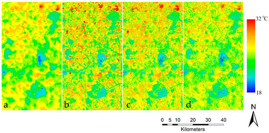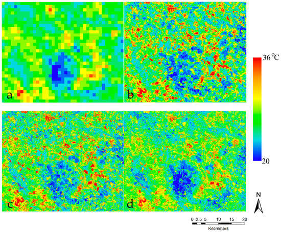 Sharpening brightness temperature images from a 960-m to a 60-m resolution for Site 1. (a) Sentinel-3 BT at 960 m. (b) Reference Landsat 8 BT at 60 m. (c) Sharpened to 60-m BT derived from applying TsHARP to aggregated Landsat 8 using Landsat 8 60-m Normalized Difference Vegetation Index (NDVI). (d) Sharpened to 60-m BT derived from applying TsHARP to Sentinel-3 using Sentinel-2 60-m NDVI.