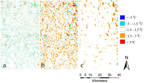 The TsHARPLandsat and TsHARPSentinel images were compared with the reference BT images at a 60-m resolution by computing the error difference (reference BT minus downscaled BT). Maps of the differences between the three images (the two sharpened temperatures TsHARPLandsat minus TsHARPSentinel and the Landsat reference image) for Sites 1 and 2, are presented in Figure 7 and Figure 8, respectively. In Site 1, both TsHARPLandsat and TsHARPSentinel imagery underestimated the temperature over forests and dense vegetation and overestimated the temperature over sparse vegetation fields and bare soils compared with the reference temperature. Differences >3 °C were observed in 0.09% of the area (1,283 pixels out of a total of 1,357,185 pixels in the scene) for TsHARPLandsat, and, in 7.2% of the area (98,216 pixels), the errors ranged from 1.5 to 3 °C, mostly along the borders of fields and riparian areas. This can be explained by the high correlation between BT and NDVI (Figure 7a). Agam et al. [21] reported that sharpening of homogeneously vegetated areas results in smaller errors due to the accurate fitting of the BT-NDVI regression model. For TsHARPSentinel errors > 3 °C were observed in 1.4% of the area (19,128 pixels) and errors ranging from 1.5-3 °C were observed in 20% of the area (270,511 pixels) (Figure 7b). This is likely due to loss of accuracy between different satellite platforms. Over this site, the Sentinel-based sharpened temperatures were mostly lower than those from TsHARPLandsat (Figure 7c).