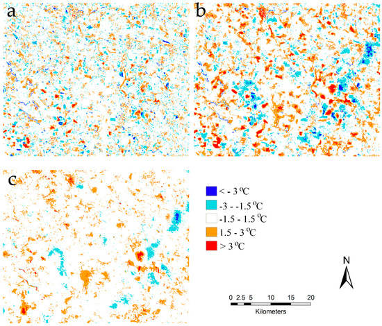 Residuals maps of (a) TsHARPLandsat at a 60-m spatial resolution. (b) TsHARPSentinel at a 60-m spatial resolution, and (c) difference between TsHARPLandsat and TsHARPSentinel for Site 2.