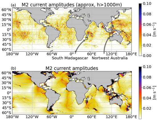 where . M2 baroclinic currents exhibit a spatial structure characterized by interfering beams originating from well-defined generation spots (e.g., islands archipelagos, sills) and typical amplitudes around 10 cm/s in the open-ocean (Figure 1a).