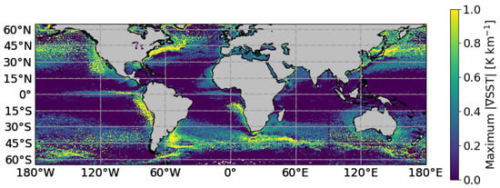 The climatology of the maximum SST gradient magnitude is courtesy of Peter Cornillon, Graduate School of Oceanography, University of Rhode Island (URI). This climatology is obtained from the entire (1985–1996) Pathfinder 9 km resolution SST dataset and is based on the automated procedure by [22] and [23,24,25] and developed by [26,27,28]. Further technical details may be found in this report from the Danish Meteorological Institute (DMI) [29]. The distribution of maximum SST gradient indicates SST spatial gradients exceeding °C near western boundary currents, upwelling areas, the antarctic circumpolar current (Figure 2). The coarser resolution of the SST used for this climatology compared to the SST observations described in Section 2.3 may impact the expected amplitudes of tidally induced SST fluctuations using the climatology. The later may be underestimated compare to what would be estimated with higher resolution SST data to an extent that is difficult to anticipate.