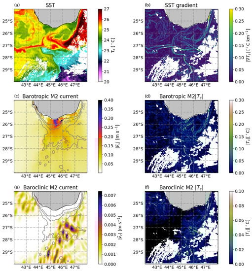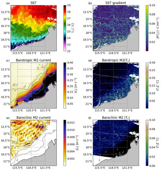 Figure 3 illustrates the procedure to quantify the signature of M2 SST fluctuations for the Northwest Australia case study region. We first compute the Sobel gradient of the SST field then we retrieve M2 baroclinic and barotropic currents for regions. Finally the amplitude of SST fluctuations associated with baroclinic and barotropic currents are estimated by taking the product of SST gradients and tidal currents (Equation (7)).