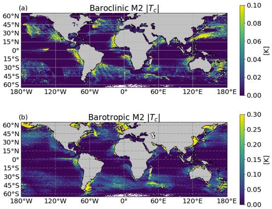 (a) Estimation of the amplitude of M2 IW signature on SST. (b) Estimation of the amplitude of M2 barotropic signature on SST.