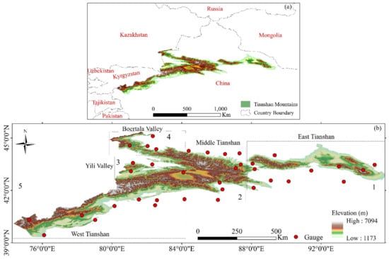 (a) Geographical location of the Tianshan Mountains. (b) Extent and topography of the Tianshan Mountains, boundaries of the sub-regions, and locations of the rain gauges.