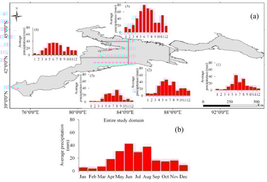 The performance of three SPPs was assessed over the Tianshan Mountains (Figure 1), the largest mountain system in central Asia. These mountains are located on the northwestern periphery of China [], and their estimated area is about 800,000 km2 []. The total stretch (from east to west) of the Tianshan Mountains is about 2000 km, and about 1700 km is in China []. This region has a very complex topography; the elevation varies from 7094 to 1173 m with a west to east gradient. The orientation and altitude of these mountains have a substantial influence on the patterns of regional weather and spatiotemporal distribution of precipitation []. These mountains experience a continental arid climate because they are at the furthest distance from the oceans (compared to the other large mountain systems in the world) []. These mountains contain several intermountainous river basins, glaciers, desert oases, and valleys [,]. The westerly circulation system and regional orographic lifting are the main sources of precipitation. Precipitation varies greatly with space and time (Figure 2), with more precipitation in summer and less precipitation in winter. Considering the accessibility of gauge-based precipitation data, only the Chinese part of these mountains (between latitudes 39°–46° N and longitudes 74°–96° E) (Figure 1) was selected for the assessment of SPPs. On the basis of distinct hydroclimatic conditions, these mountains can be divided into five sub-regions: East Tianshan (1), Middle Tianshan (2), Yili Valley (3), Boertala Valley (4), and West Tianshan (5). The sub-regional boundaries (as shown in Figure 1) were delineated by following Xu et al. []. The general characteristics of considered sub-regions are presented in Table 1. The Yili Valley experienced the highest average annual precipitation, while the lowest average precipitation was observed in the West Tianshan region (Figure 2). In the study domain, June was the month of highest precipitation while February was the month of lowest precipitation.