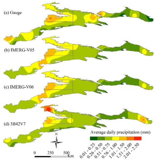 Figure 4 shows the comparison of temporal variations of average daily precipitation obtained from the in situ gauging stations and three SPPs in the study domain. The time series of average daily precipitation was estimated by taking an average of daily data from the gauges, IMERG-V05, IMERG-V06, and 3B42V7 for the period from June 2014 to December 2017. Previously, Palomino-Angel et al. [] used the same method to compare the reference and satellite-based mean daily precipitation over northwestern South America. Visual inspection of the results suggests that all SPPs were generally able to reproduce the temporal variation of observed precipitation. However, two months (July and September) of high-intensity precipitation were identified; these months were captured well by all SPPs. However, observed daily precipitation data (from gauges) varied more than the estimated precipitation data (from SPPs). Gauge-based daily precipitation varied between 0.00 and 5.95 mm/day, with an average of 0.65 mm/day. In comparison, the precipitation estimates from the SPPs varied between 0.00 and 4.08 mm/day (average daily = 0.67 mm/day) for IMERG-V05, between 0.00 and 4.03 mm/day (average daily = 0.64) for IMERG-V06, and between 0.00 and 4.95 mm/day (average daily = 0.61 mm/day) for 3B42V7.
