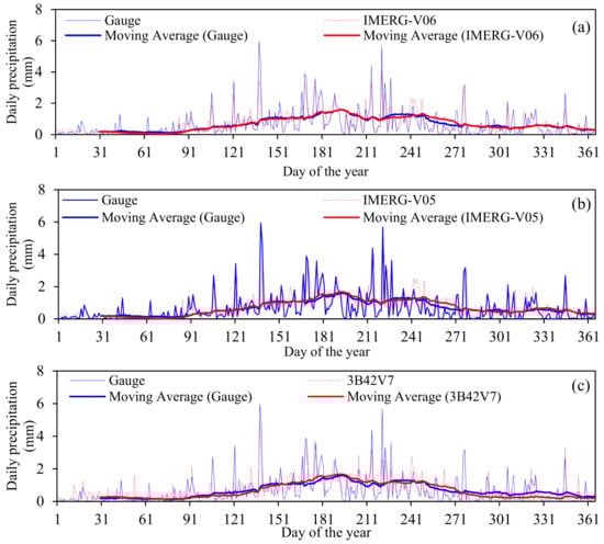 Comparison of average daily precipitation time series obtained from the reference gauging stations and three precipitation products ((a) IMERG-V06, (b) IMERG-V05, and (c) 3B42V7) over the entire study domain for the period from June 2014 to December 2017.