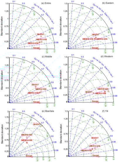 Moreover, Taylor diagrams were used to provide a concise summary of the performances of the SPPs with reference to the gauge-based data. These mathematical diagrams are able to display the relative skill of SPPs by exploiting the relationship between CC and normalized RMSE and standard deviation (SD) []. In these fan-shaped diagrams, the angular coordinates represent the CC values, concentric semi-circles indicate the RMSE values, and radical coordinates show the values of SD. In these diagrams, a lesser distance between the reference point and satellite point represents a better performance of that product. The performance of a satellite-based precipitation product was considered satisfactory if its CC value was higher than 0.70 and its value of normalized RMSE was lower than 0.50 [].
