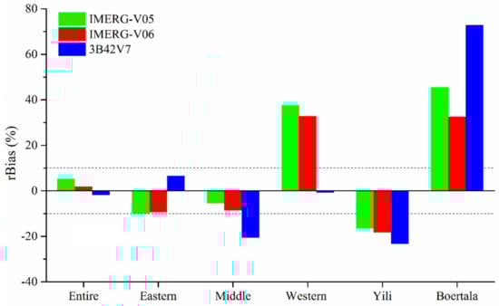 Relative bias (rBias; %) for three satellite-based precipitation products over the considered regions. Dashed lines represent the thresholds (± 10%) of rBias.