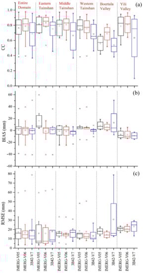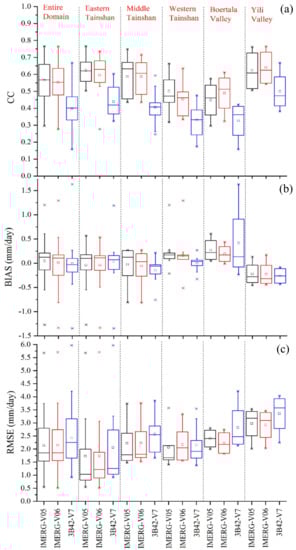 Boxplots of (a) CC, (b) BIAS, and (c) RMSE for three SPPs at daily scale over the entire Tianshan Mountains and considered sub-regions. The horizontal lines inside the boxes show the median values and small squares indicate the mean values.