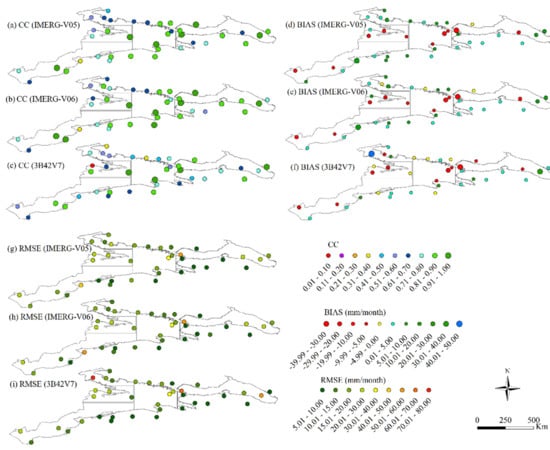 Figure 8 shows the comparisons of CC, BIAS, and RMSE calculated at each gauging station for three SPPs at a monthly scale. Compared to the 3B42V7 data, the correlations between the gauge-based observations and precipitation estimates from both IMERG products were generally higher at most of the stations. Generally, values of CC were lower over the southern fringe of the Eastern Tianshan and the northern fringe of Middle Tianshan (Figure 8a–c), where average precipitation was comparatively low. Comparisons of both versions of IMERG showed no significant improvement in CC of version 6 as compared to that of version 5. Spatial distribution of the values of BIAS of three SPPs indicated that all products were less biased with the reference data over the southern fringe of the Tianshan Mountains. Most of the negative values of BIAS were found in the Boertala Valley. Generally, both IMERG products were more biased compared to the 3B42V7 product (Figure 8d–f). Likewise CC, no considerable enhancement in the BIAS of IMERG-V06 was witnessed as compared to the IMERG-V05 product. Compared to the 3V42V7 product, IMERG products generally showed slightly smaller values of RMSE (Figure 8g–i).