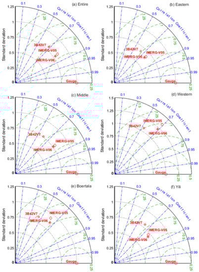 Taylor diagrams displaying the relative performances of the monthly precipitation estimates from IMERG-V05, IMERG-V06, and 3B42V7 products for the (a) Entire study domain, (b) Eastern Tianshan, (c) Middle Tianshan, (d) Western Tianshan, (e) Boertala Valley, and (f) Yili Valley. The values of root mean square error (RMSE) are represented by concentric semi-circular green lines.