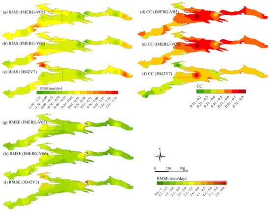 A satellite-based product is regarded as perfect if the BIAS and RMSE are zero, and the CC is 1. Previous studies [,] have defined the threshold values of rBIAS and CC for the acceptable performance of precipitation products. According to those studies, the performance of a precipitation product is satisfactory if the estimated value of rBias is within the range of −10% to 10% and CC is higher than 0.7. The positive/negative values of BIAS represent the overestimation/underestimation of precipitation magnitude.