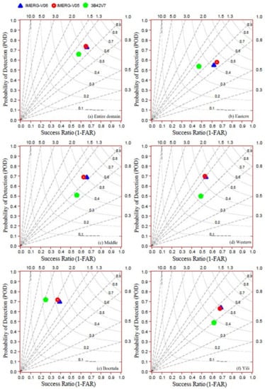The skill of SPPs in capturing the occurrence of precipitation events was illustrated in terms of POD, CSI, SR (1-FAR), and BIAS. We used the Roebber performance diagram (known as a performance diagram) to represent the geometric relationship between these four quality measures. Many researchers have utilized this diagram to elaborate the performance of remotely sensed precipitation estimates in different regions, such as Pakistan [], Egypt [], and Brazil [,]. In a performance diagram, if the values of POD, SR, CSI, and BIAS for an SPP are closer to unity, then the performance of that SPP is considered as reliable. Figure 12 shows the relative abilities of IMERG-V05, IMERG-V06, and 3B42V7 products against daily reference data in the entire study domain and considered sub-regions. In all spatial domains, both IMERG products showed better performance than the 3B42V7 product, as indicated by relatively closer positions of IMERG-V05 and IMERG-V06 to the reference point. The enhancement in precipitation detection skills of the IMERG products was mainly due to the increase of POD and SR. All SPPs were able to detect the occurrence of precipitation events in the entire study domain. Conversely, the performance of all SPPs was poor in the Boertala Valley, albeit their POD values were greater than 0.70. Interestingly, as with other quality measures, no considerable enhancements in the quality measures (POD, SR (1-FAR), CSI, and BIAS) for IMERG-V06 were noticed as compared to the values of these measures for IMERG-V05 for all spatial domains.