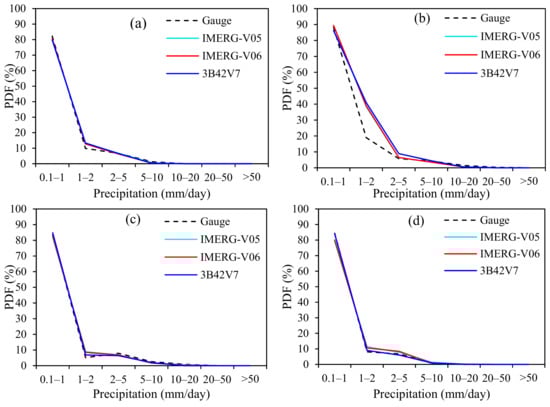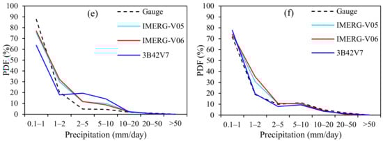 The probability density function (PDF) of daily precipitation events recorded by the reference gauges and three satellite products (3B42V7, IMERG-V05, and IMERG-V06) was assessed at different thresholds. In this study, the thresholds of daily precipitation rates were selected by following the guidelines of the World Meteorological Organization (WMO). The PDFs were evaluated for the entire study domain and for the five sub-regions.
