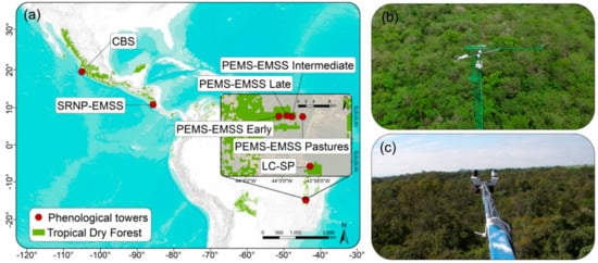 We conducted this study at four TDFs in the Americas (Figure 1). These sites are home to long term phenology and carbon flux studies by Tropi-Dry (www.tropi-dry.org). These sites represent four different TDF communities with particular characteristics of temperature, precipitation, and length of dry season (Table 1). The first site is located at the Chamela Biological Station (CBS), Jalisco, Mexico. This site presents an undisturbed TDF with drought-deciduous vegetation []. The phenological and flux tower height is close to 10.5 m. The second site is located at the Santa Rosa National Park–Environmental Monitoring Super Site (SRNP-EMSS), Costa Rica. This site presents a mosaic of forest patches with different ages [] resulting from different land-use histories associated with anthropogenic fires, intense deforestation, and clearing lands for pasture [,]. The tower height at this site is close to 18.0 m. The other two sites are located at the Lagoa do Cajueiro State Park (LC-SP) and Parque Estadual da Mata Seca–Environmental Monitoring Super Site (PEMS-EMSS). These two sites present a mosaic of forest covers at different stages of secondary succession, which is surrounded by an agricultural matrix []. The LC-SP tower height is close to 15 m. At the PEMS-EMSS there are four towers located along a successional gradient, as follows: (i) Pastures (canopy height = 3 m), early (5–20 years, tower height = 8 m), intermediate (20–50 years, tower height = 15 m), and late forest (>50 years, tower height = 22 m) (See Rankine et al. [] for a detailed description of these forest sites). The height of these towers varies between sites; however, these maintain a distance close to 3–6 m above the forest canopy.