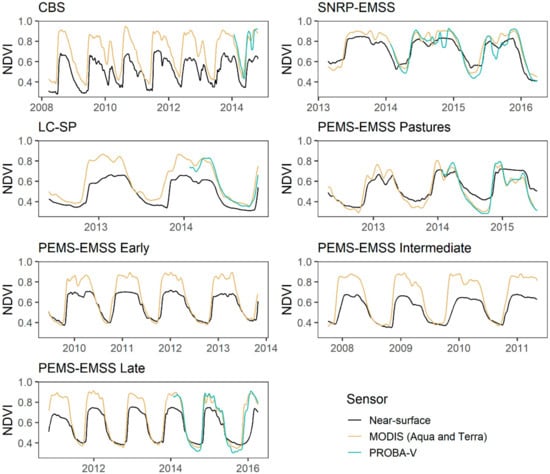 Since the NDVI values are by definition sensor-dependent [] and the magnitude of variation of NDVI depends on how the light interacts with the surfaces [], as well as the preprocessing of these products (e.g., aerosols or atmospheric corrections), we performed a standardization of the NDVI from both the satellite and the near-surface observations. Precisely, the variability of each NDVI time series was standardized using the following formula: (observation − minimum)/(maximum − minimum). This was applied to the entire multi-annual time series for each sensor and pixel. On the near-surface time series, this formula was applied twice per case of match of observations with MODIS and PROBA-V. With this method, the standardized NDVI (NDVIS) values were transformed to a range between 0 and 1, avoiding the effects of the variation in amplitude between sensors and allowing comparisons between NDVI trends. Calculations of the NDVIS have also been performed by studies to validate MODIS products using landscape phenology indices from plot-level observations [] or to study temporal anomalies [].