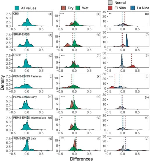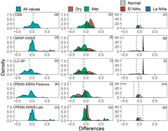 Overall, our results reveal that the density distributions of the NDVIDS between near-surface observations and MODIS tend to be close to 0 (Figure 3a,d,g,j,m,p,s). This trend does not seem to follow in some sites when the NDVIDS between optical towers and PROBA-V are compared (Figure 4a,d,h,k,n). Likewise, the density distribution appears to be more contrasting and different from 0 when these are compared between seasons or ENSO months. Specifically, results comparing near-surface observations and MODIS show that the NDVIDS tend to be higher in five sites (CBS, PEMS-EMSS Pastures, Early, and Intermediate) during the wet season but not during the dry season (Table 3, Figure 3b,k,n,q). The exception of this trend is present at LC-SP and PEMS-EMSS Late succession sites (Figure 3h,t), where the NDVIDS comparisons seems to have an inverse pattern to the one above. NDVIDS comparisons at SRNP-EMMS seem not to be affected by the seasons (Figure 3e). Results comparing near-surface observations and PROBA-V reveal that the NDVIDS tend to differ between seasons at the PEMS-EMSS Pastures and Late succession sites (Figure 4l,o and Table 3), but not at CBS, SRNP-EMSS, and LC-SP (Figure 4b,f,i and Table 3). Comparing among ENSO months, the results showed that the NDVIDS derived from near-surface and MODIS observations differ in CBS, PEMS-EMSS Pastures, and PEMS-EMSS Late succession (Figure 3c,l,u, Table 3). Similar to above but comparing near-surface and PROVA-V observations, the NDVIDS differed in SRNP-EMMS and PEMS-EMSS Pastures during ENSO months (Figure 4g,m, Table 3). Overall, although some comparisons of NDVIDS between near-surface and satellite sensors reveal differences between seasons and ENSO months, there is not a clear trend of higher or lower NDVIDS values during the wet or dry season, or in a given ENSO month.