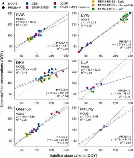 The SMA regressions reveal that some phenometrics derived from near-surface observations tend to have a strong 1:1 relationship with those derived from satellite observations (Figure 5). Specifically, the SMS regressions indicate that the DOY of the phenometrics derived from both satellites, such as the SWS, EWS, green-up, and maturity showed relationships with R2 higher than 0.82 and slopes close to 1. On the other hand, the DHV and DLV phenometrics extracted from satellite observations seem to be inconsistent with those derived from near-surface observations (Figure 5). For example, the relationship of DHV between MODIS and near-surface sensors showed a R2 = 0.45, while the relationship of DLV between PROBA-V and near-surface sensors had a R2 = 0.34. Despite the low association between sensors in these phenometrics, the test which compares the slopes suggests that all slopes from the SMA regressions do not differ from 1 (Table 4).