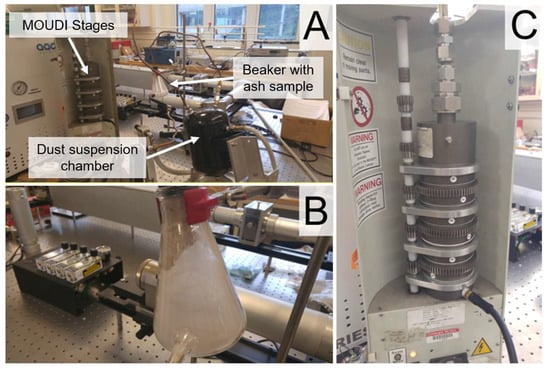 The MOUDI instrument at the Air Quality Laboratory, Carnegie Mellon University. (A) Laboratory set-up where air is regulated to the appropriate flow rate before entering the beaker; (B) beaker containing the ash sample, which is drawn into the dust suspension chamber before entering the MOUDI stages; (C) different particle-size stages. A pump is attached to the base of the final stage and used to draw the air and suspended particles through each MOUDI stage.