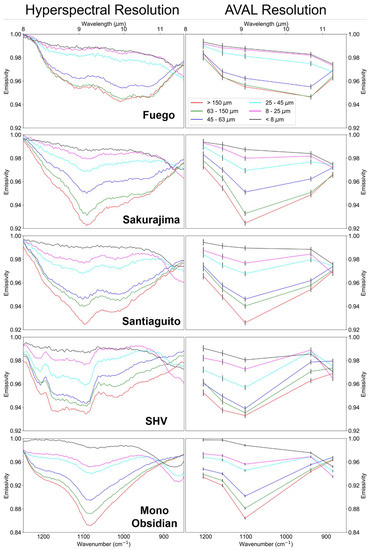 The full laboratory and ASTER resampled resolutions of all the ash samples are shown in Figure 2, subset to the ASTER TIR spectral range of 1250 to 833 cm−1 (8–12 µm). The shift to higher wavenumber (lower wavelength), resulting from increasing SiO2 content is seen in the AVAL spectra as a lower emissivity at shorter wavelengths (e.g., ASTER band 10; 8.291 µm) for the more silicic samples. Figure 3 also demonstrates the level of success obtained by the sample cleaning, sieving and MOUDI separation for each size fraction, which eliminates the introduction of contamination possible in other separation approaches. In most cases, each spectrum is distinct (non-overlapping) with smaller particle-size fraction spectra having progressively higher overall emissivity caused by increasing particle scattering created by the larger surface area of smaller particles, thus a greater amount of energy is detected [34]. This increase in emissivity for the primary spectral feature is coupled with the development of transparency features (TF) at lower wavenumbers, the depth of which conversely increases as particle-size decreases, caused by volume transmission in this wavenumber region [55]. In the AVAL spectra, the development of this TF is visible as a reduction in emissivity at <900 cm−1 (<11.1 µm). Only the Fuego spectra display less distinction between certain particle-size fractions, which is particularly evident in the two largest. This may be caused by the higher mineral percentage in this sample or potentially the presence of small vesicles, which mimic the behavior of a blackbody and decrease the spectral contrast [56]. The combination of spectral shape, band depth and the appearance of lower wavenumber transparency features demonstrates, however, the unique nature of each spectral suite, and their potential application for deriving both composition and particle size from emissivity data extracted from TIR image data of an active plume.