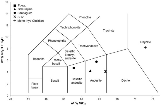 The positional change of the Christiansen frequency emissivity maximum to shorter wavelengths is attributed to an increase in SiO2 in the sample [54]. This increase is seen in Figure 2, where the emissivity maximum shifts from 1265 cm−1 (7.9 µm) for Fuego to 1338 cm−1 for SHV (7.4 µm). A discrepancy exists for the Christiansen frequency of the SHV sample relative to the Mono-Inyo obsidian. This may be because of the crystalline polymorph, which would cause a shorter wavelength Christiansen frequency position, despite SHV having an average lower SiO2 content.