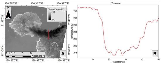 (A) AST_08 temperature product image of the Sakurajima Volcano, captured 29 April 2010. A plume is clearly emanating from the source vent. The red line indicates one of the transects taken through the plume to obtain the temperature information shown in (B). This plot demonstrates the distinct lower temperatures found in the plume relative to the ground surface, as there is a sharp contrast in temperature between these two regions. In this area, it is assumed that the plume is opaque and that ground-upwelling radiance is transmitted through the plume.