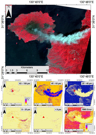 (Top Panel) ASTER VNIR image of the Sakurajima Volcano from 29 April 2010. (Bottom Panels) Areal percentages of each Sakurajima library end-member derived from the linear deconvolution algorithm applied to ASTER data acquired on 29 April 2010. Each panel refers to the particle-size result. The bottom right image is the RMS error (or overall fit of the model). Red triangle indicates the location of the Showa crater from which the ash cloud was generated.