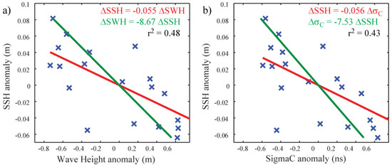 anomaly explained by SWH anomaly. Here, we perform the regression the other way (corresponding to the green line) to give the proportionality value,