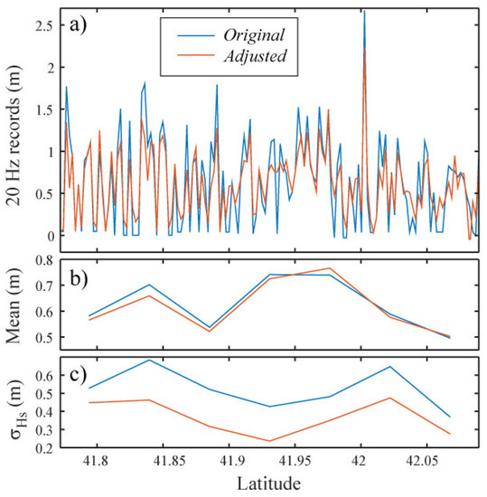 A further demonstration of the efficacy of the proposed adjustment was the improved agreement between two independent (but very similar) altimeter systems. With adjustments to the Hs values for both Jason-2 and Jason-3, the S.D. of the discrepancy between the two reduces by ∼22%, in line with the change in estimated noise for one instrument. Note that as the two follow the same track within a very narrow deadband, the effect of omitting the MSS term should be similar for both instruments.