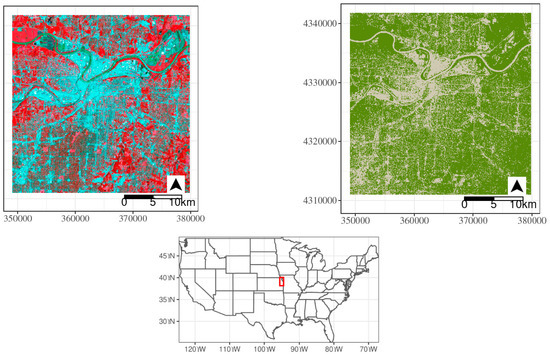The Kansas City metropolitan area (left)—shown as a false color composite Landsat image from 6 June 2011—exhibits characteristic patterns of urban sprawl. The spatial distribution of green space (right) with green pixels representing green space and grey pixels representing all non-vegetated surfaces. The location of Kansas City within the U.S. is also shown.