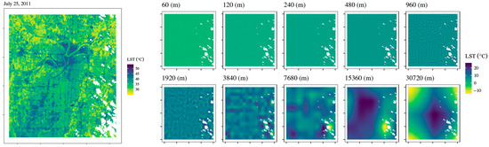 Ten-level wavelet decomposition (right) of the land surface temperature (LST) image from 25 July 2011 (left). The levels of decomposition show the contribution of each pixel to LST variability at each scale. The level one 60 m decomposition was discarded from the subsequent analysis.