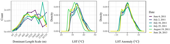 Distribution of dominant length scales (left), LST (middle), and LST anomalies (right) by date.