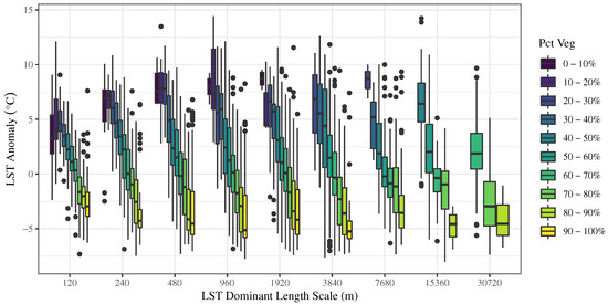 Boxplots showing the interquartile range of LST by the percent of vegetation and the dominant length scales. The bar in each box shows the median and the dots indicate outliers. LST varies only slightly by dominant length scale and decreases as the percent of vegetation increases, regardless of the dominant length scale.