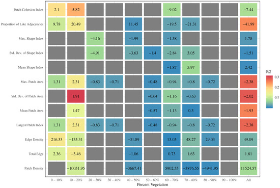 LST regressed on the metrics for each percent vegetated class. The numbers are the slope coefficient for models significant at and the color indicates the value of the regression models. The rightmost column is LST regressed on the metrics without controlling for the percent of vegetation.