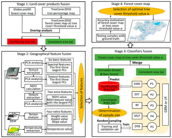 - Clinton, N.; Yu, L.; Gong, P. Geographic stacking: Decision fusion to increase global land cover map accuracy. ISPRS J. Photogramm. Remote Sens. 2015, 103, 57–65. [Google Scholar] [CrossRef]