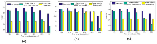 | Forest in the USGS TreeCover2010 with Different Tree Cover Threshold Values | Forest in the GlobeLand30 | |||||||||