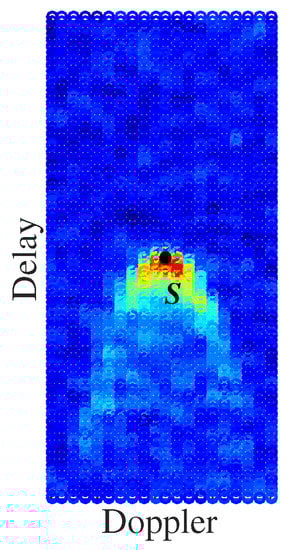 These three conditions (delay, Doppler and geometry) are considered in the verification of a target candidate. The path delay , and Doppler frequency of a given target candidate can be calculated using the position and velocity information of the transmitter, receiver, and the target candidate. In addition, the path delay , and Doppler frequency of the bright points of Figure 2 were already obtained in the previous part. Then, the path delay difference between a particular target candidate and the bright point can be obtained, and similarly, the Doppler frequency difference can also be obtained. It should be noted that is between 0 and km, which eliminates the impact of C/A code ambiguity. The delay and Doppler frequency conditions are that and should be smaller than particular thresholds, which are discussed in the next section. The geometry condition is that the target candidate can be seen by the transmitter, and that its altitude is less than that of the TDS-1.