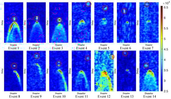 Fourteen delay Doppler maps (DDMs) of TDS-1 containing anomalous features that are marked by red circles.