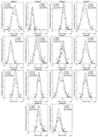 Probability distribution functions of the background noises for the 14 events, which are presented by black dots. The noises are assumed to obey normal distributions, and the normal distribution functions with the means and standard deviations corresponding to these of the noises are obtained. () is 99% confidence interval of the normal distribution functions. The blue curves are the results of normalising the normal distribution functions to fit the black dots. is the correlation power value for the bright point.