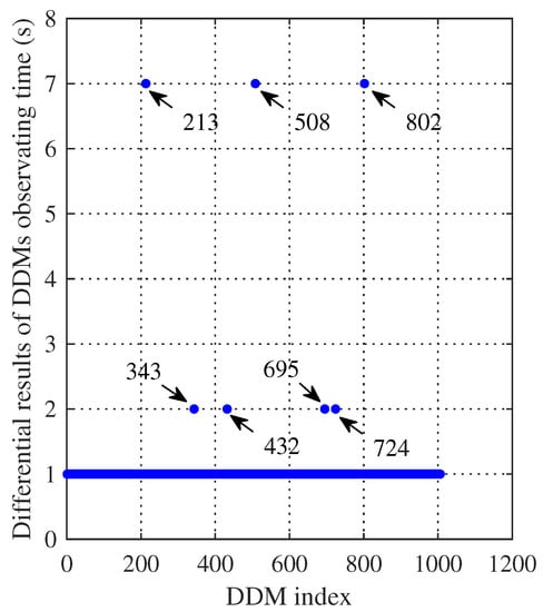 The investigation of DDM generator is to check if the 14 events happened just after the DDM generator recovers from loss of track. Differential operation is applied to DDMs observation time for the tracks involved in the 14 events to find if and when DDM generator lost tracking. Then the observation time of each event is compared with the DDM generation recovery time. Figure 5 is the differential results of the DDMs observation time of Track ID “20180914H18Group05”. This track involves Events 1, 2, and 3, which can be seen from Table 1. The horizontal axis is DDM index in the track, which is of convenience to indicate the observation time. TDS-1 outputs DDMs every second, so the differential results of Figure 5 are mostly 1. However, there are seven outliers which means that the DDM generator loses tracking for seven times during this track. The DDM indexes corresponding to the outliers are shown in the figure. The DDM indexes for Event 1, 2 and 3 are 407, 447, and 498 respectively, which are not around the time that the DDM generator loses tracking. The same results are obtained for the other 11 events, and details are not shown here.