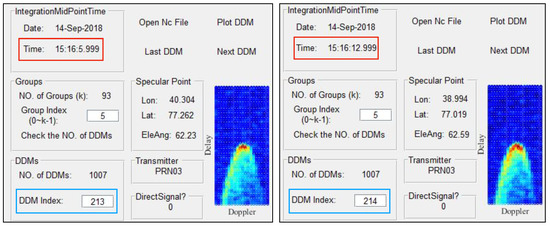 Figure 6 gives the two DDMs that are just before and after the DDM generator loses tracking at DDM index 213 of Figure 5. The DDM indexes are marked by blue rectangles, and observation time by red rectangles. It can be seen from Figure 5 that the DDM generator loses tracking for seven seconds at DDM index 213, which is confirmed by the observation time difference between 15:16:5.999 and 15:16:12.999 of Figure 6. It can be seen from Figure 6 that the two DDMs show a very clear “horseshoe” pattern without any strange patterns. This is understandable because TDS-1 receiver uses on-board-calculated specular point to estimate the delay and Doppler of the reflected signals, to keep tracking the reflected signals. All the tracks relating to the 14 events are checked and it is found that there are no outliers in the positions of the on-board-calculated specular points, even if the DDM generator loses tracking. Therefore, the bright points are not caused by the DDM generator losing tracking.