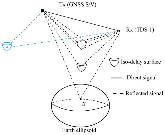 Illustration of geometry model used in the retrieval of the target position, as shown by black lines. The blue lines give a typical example of unpredictable reflection conditions. S is specular point on the Earth’s surface.